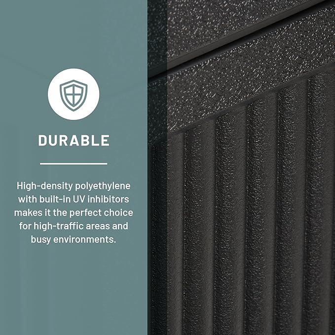 • Outdoor and Indoor USE. Molded from high-density polyethylene with UV inhibitors, this waste container performs well in both outdoor and indoor conditions. Telescoping base hides liner bag and includes a recessed bottom for easy maintenance.