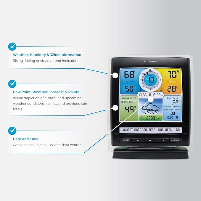 - Weather Clock: The indoor weather station display is a large, color LCD Display with the current time, date, and an adjustable dimmer, making it convenient to read and easily view indoor and outdoor data, time, and conditions