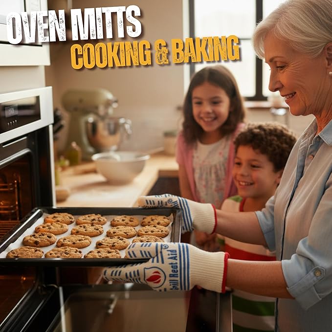- 🔥 EXTREME HEAT RESISTANT GLOVES: Premium kitchen mitts for oven EN407 certified, withstanding heat up to 1472°F. Crafted from 100% Aramid flame retardant fabric aka Kevlar Gloves, oven mitts heat resistant gloves handle hot cookware and flames.
