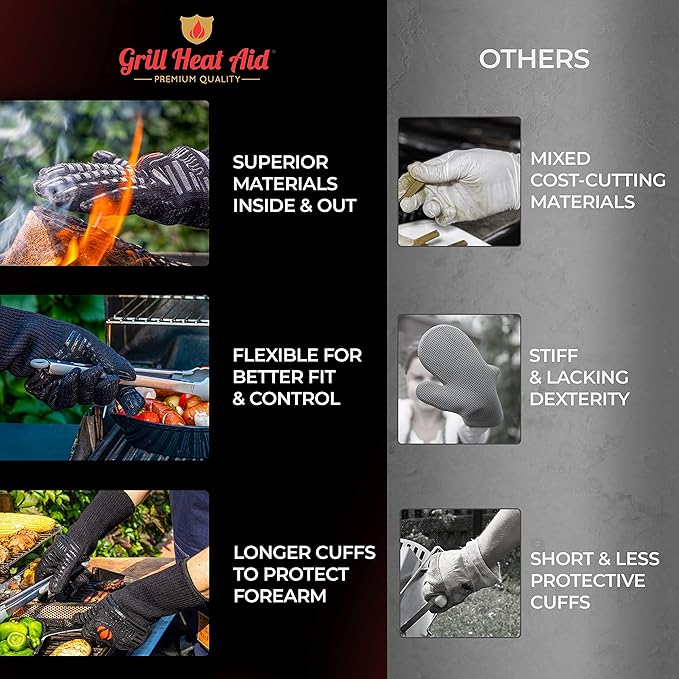 GRILL HEAT AID BBQ Grill Gloves Heat Proof for Grilling – Fireproof 1472°F Heat-Resistant Grill Mitts for Outdoor Barbecue and Smoker, Campfire, Fire Pit, Oven Glove with Fingers for Baking Pizza