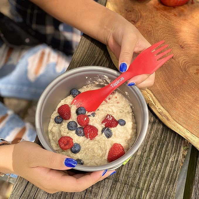 - 3-in-1 Camping Utensils Set: This set of 8 sporks is designed for convenience & suits all ages; each camping spork features a spoon for soups, a fork for sausages or fish, and a serrated edge that works as a knife for cutting & peeling fruit or other foods