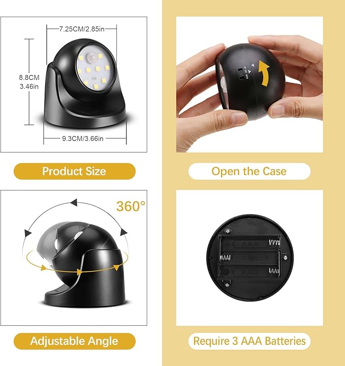 - 【360°Rotatable IP44 Waterproof】The motion detector night lights can be rotated 360°, and the sensor has a detection angle of 90°, allowing you to adjust the direction to meet all your needs. The battery operated light meets the IP44 waterproof rating, making it suitable for both indoor and outdoor use. TIPS: It is better to be placed in a sheltered area when using it outdoors.