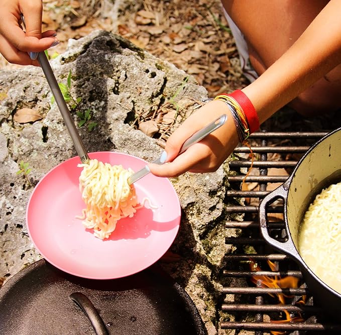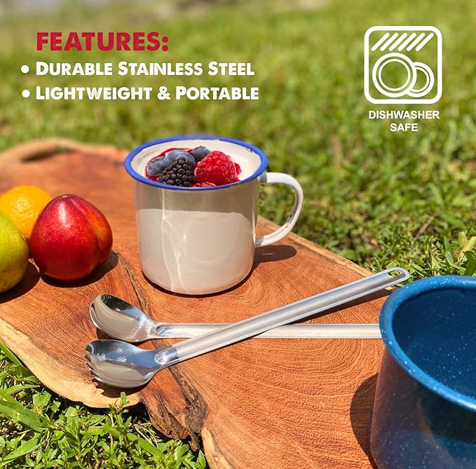 - Ultimate Durability & Grip: Our camping silverware is made from polished stainless steel for long-lasting use; the long spoon & spork feature textured handles to ensure a proper grip in wet or cold conditions
