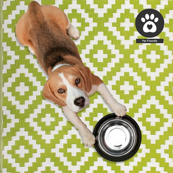 FH Home Outdoor Rug - Waterproof, Fade Resistant, Reversible - Premium Recycled Plastic - Geometric - Large Patio, Deck, Sunroom, Camping, RV - Aztec - Green & White Crease Free - 6 x 9 ft