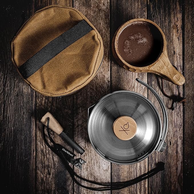 überleben Kessel Camp Kettle - Camping Cookware, Tea Kettle - 37fl oz Camping Pot for Boiling Water - Bushcraft Cooking Gear, Campfire Kettle w/Locking Lid & Steam Vents, Canvas Bag