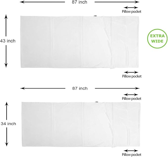 - EXTRA WIDE AND SUPER LIGHTWEIGHT: Two sizes for option: 87”x43” is an extra wide size, which is about 9” wider than a normal single liner. There’s generous space for the tall people to move freely. It weighs only 6.3oz. (180g); The 87"x34" liner weights 5oz. (140g), which is a comfortable size for one person. The liner is compacted in a tiny ripstop nylon stuff bag. With an attached hook on the carry case, you can link it up with the liner after taking the liner out, avoid losing the stuff bag.
