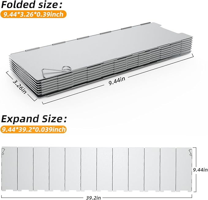- Size - Height 9.44inches, Width 39inches (3.26inches wide when folded).The backpacking stove windscreen comes with drawstring Oxford cloth bag for convenient carry and storage.Weight: 1.1 lb