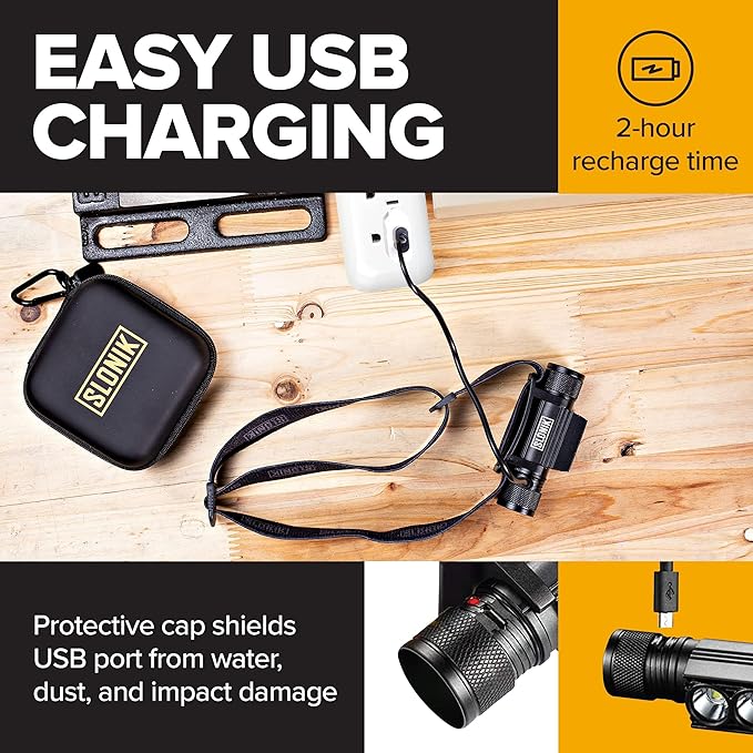 - Super Bright Power: The SLONIK 1000-lumen rechargeable headlamp lights up the night with a dazzling 60-foot beam. With 6 brightness levels and 3 modes, including an SOS strobe, you'll never be left in the dark, making it the ultimate rechargeable flashlight for any adventure