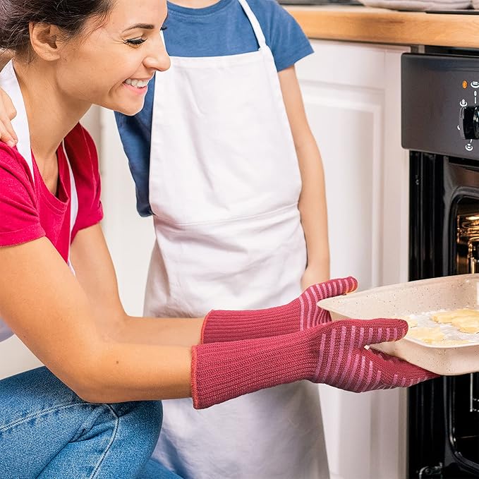 - 【Non-Slip】These heat resistant gloves covered with food-grade silicone anti-slip dots offer excellent grip,the oven mitts with fingers design make you can flexible hold different grilling forks, barbecue tools, pizza stone, dutch oven hot handles, hot pans holder, ovenware, etc.