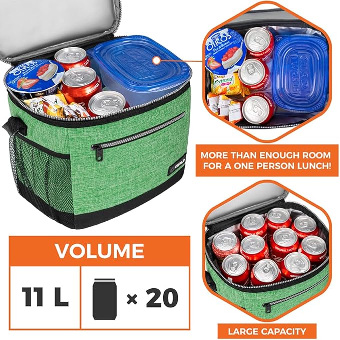- LARGE LUNCH BAG COOLER FOR MEN WOMEN: Measures 10 x 8 x 9.5inches, this heather green soft lunch cooler can hold up to 18 cans of soda or 10L of food. Fits more than two persons lunch bento with snacks. Has side, inside pockets to hold soda, water bottle, and utensils.