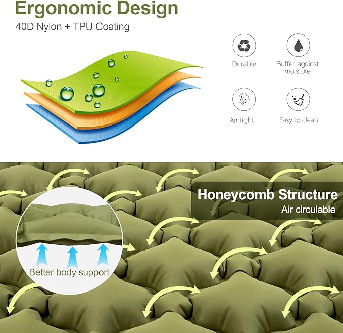 - 【Comfortable & Durable】Inflated size 195x120cm(77"x 47"), with built-in pillow. Hundreds of the honeycomb air cells can distribute your body weight to provide better support,no limit for any sleep position. TPU coated nylon fabric makes the sleeping mat less noise but more durable, also buffer against hot or cold air from the ground.