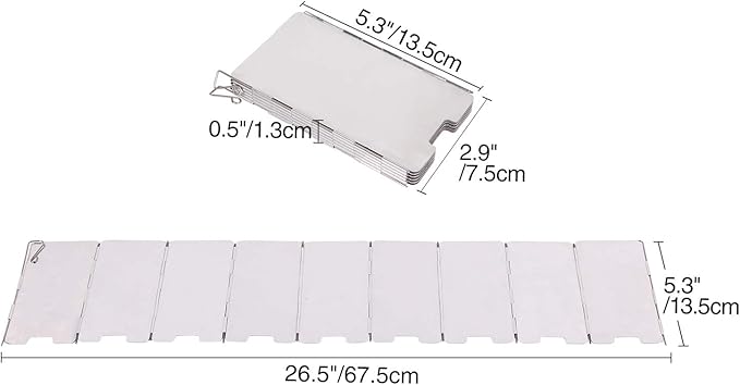 - ▶ TALL & LARGE: Folding windscreen camping stove (Unfold size)26.5"x5.3"/67.5x13.5cm. (Pack size) 5.3"x2.9"x0.5"/13.5x7.5x1.3cm. Enough to provide wind protection and big enough for both gas backpacking stoves as well as wood burning stoves