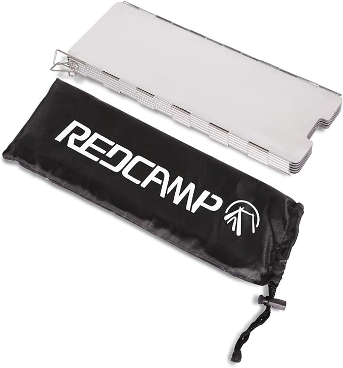 - ▶LIGHTWEIGT & COMPACT: REDCAMP aluminum windscreen has a drawstring bag for convenient storage so that it take up little space. Packing weight of the foldable stove windshield: 0.32lbs (0.145kg)