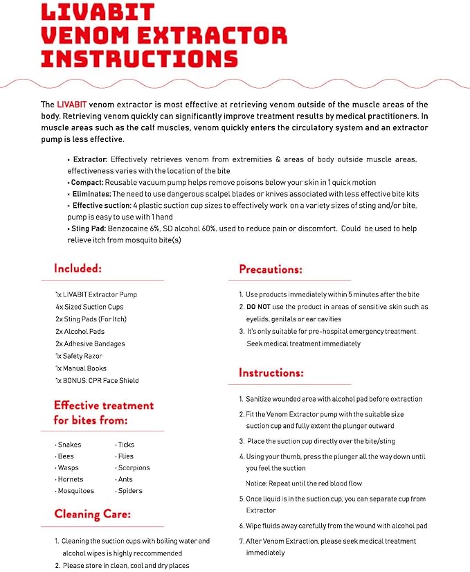 - [STRONG VENOM EXTRACTION] LIVABIT Snake Bite Kit with Antivenom Extractor Pump comes with 4 sizes of plastic cups which effectively retrieve venom and poison from extremities & areas of body outside muscle areas, effectiveness varies with the location of the bite