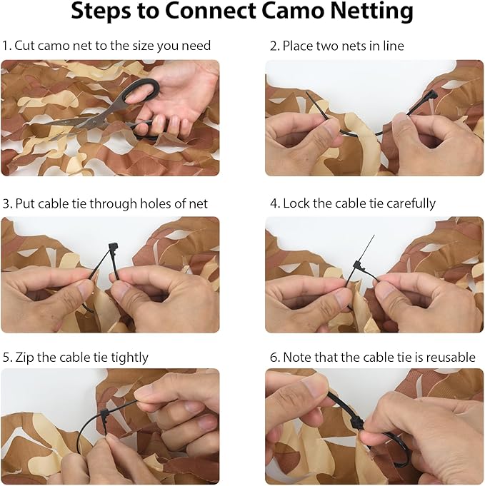 - Free Cutting: Camouflage netting can be easily cut to any size; you can use the included zip ties to fix it. Camo net can match with a variety of background colors, so you can observe the surrounding terrain well, providing maximum concealment in the field