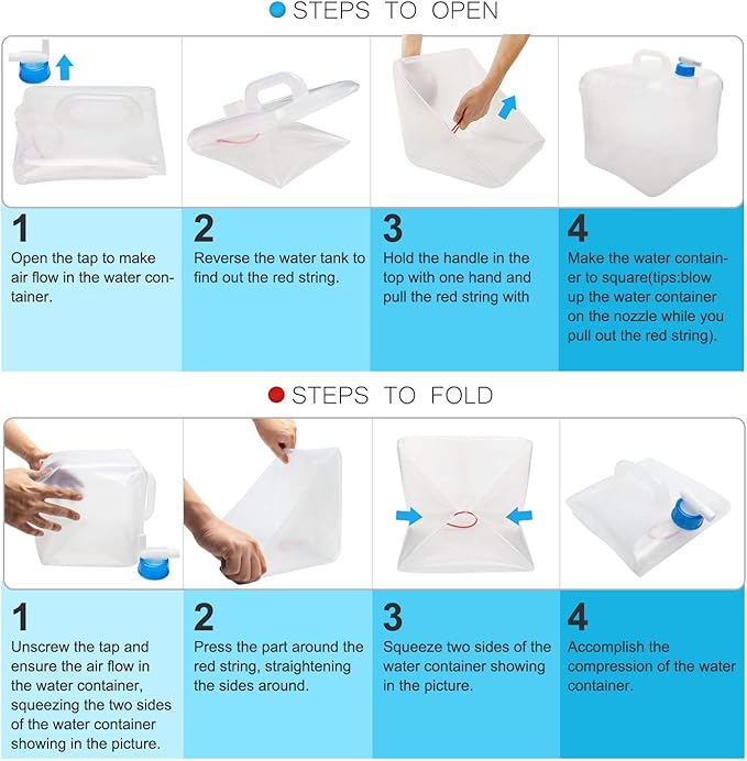 - COMPACT, PORTABLE, AND REUSABLE: This water container is space-saving and lightweight, designed to fold easily for storage. The soft molded handle makes it easy to carry, perfect for outdoor activities such as hand-washing stations, automobile/RV water storage, camping, hiking, backpacking, hunting, fishing, BBQs, picnics, parties, and festivals. It’s also ideal for household and garden use.