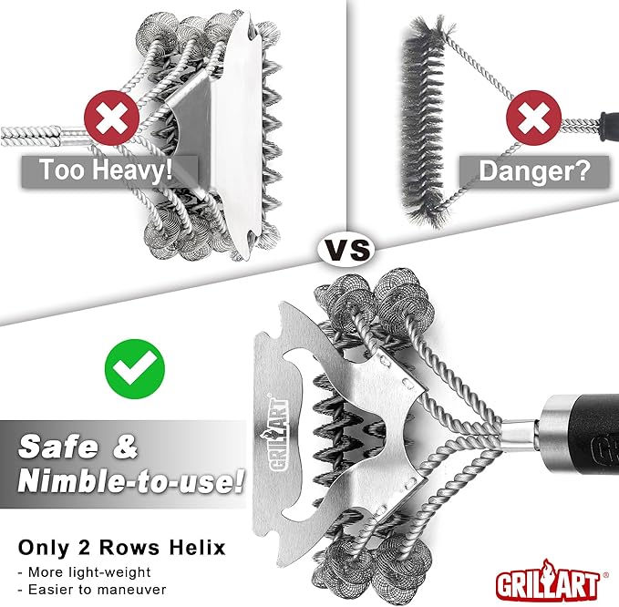 - 【Handy to Use - Double helix, Not Three】: Compared with the common 3-layer helix design, our 2-layer maybe better for you. 2-layer means lighter weight and smarter size, you can clean both large & small grill more easily as there’s no extra weight or bulky size to hinder your cleaning progress, and ultimately make your cleaning more laborious. A good BBQ brush should exist for your ease of use, rather than sacrificing its due convenience in pursuit of the so-called larger cleaning area;