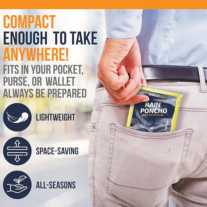 - Reliable Rain Protection On-the-Go: Stay dry and confident during sudden downpours with Hagon PRO disposable rain ponchos, offering full-length 48" x 40" coverage and a secure hood for complete weather protection. Perfect for commuters, festival-goers, emergency kits and preparedness kits, these yellow rain coats keep you ready for anything