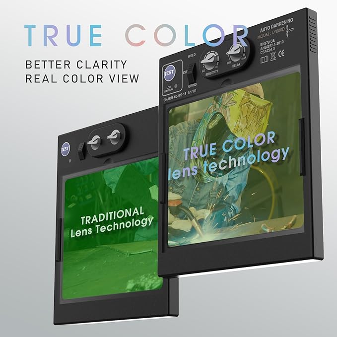 - Panoramic LARGE VIEW: The welding hood is equipped with a 3.94" x 3.23" Large View with Side View (DIN5, non-auto-darkening) featuring 1/1/1/1 optical clarity lenses and True Color technology