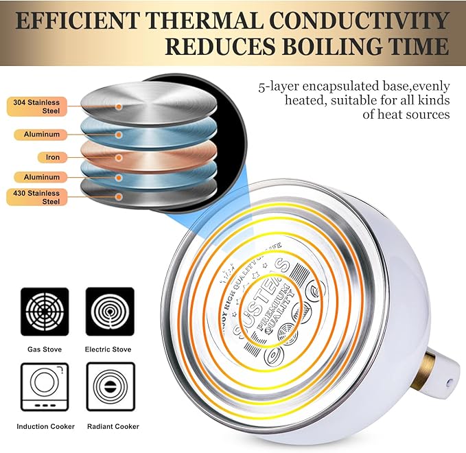 - NNOVATIVE BOTTOM BOILS WATER FASTER - SUSTEAS tea kettle is made of 5 layers encapsulated bottom, which improves heating performance while reducing heat loss, greatly shortening boiling time. It is compatible with all types of cooktops, including induction, gas, electric, halogen and radiant cooktops. You can enjoy a premium quality cup of tea or coffee at home