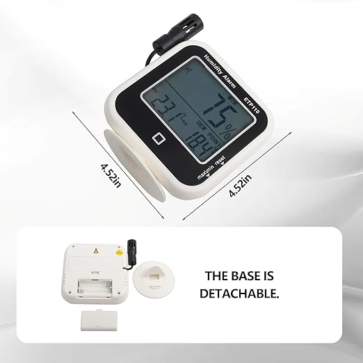 - DATA STORAGE FUNCTION -- Data storage for maximum/minimum temperature and humidity values. It can exchange degrees Fahrenheit/Celsius according to your application preference