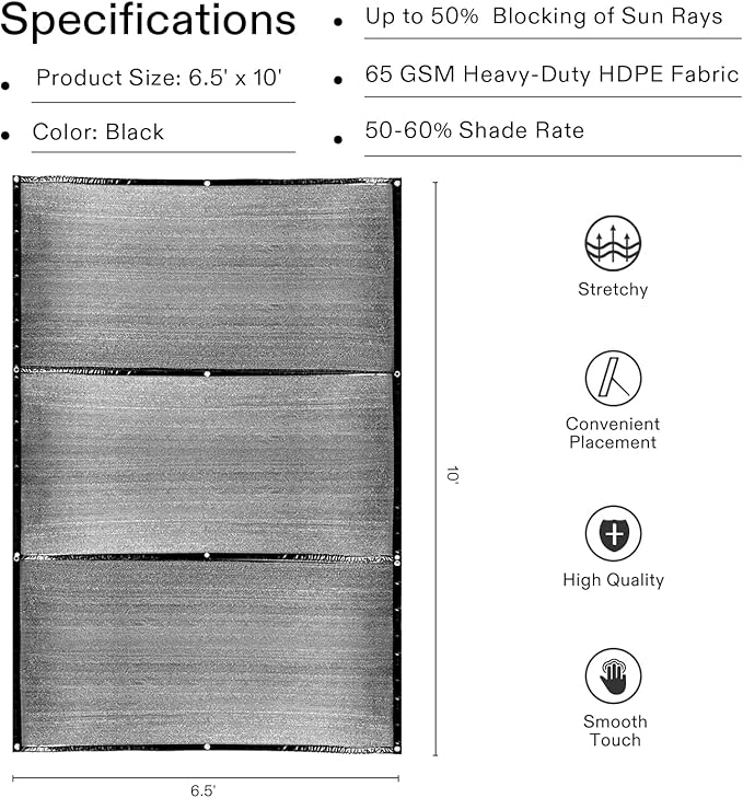 VIVOSUN Sunblock Shade Cloth, 50%-60% Shade Net, 6.5' x 10' Black Garden Shade Mesh with Grommets for Plant Covers, Swimming Pools, Patios, and Yards