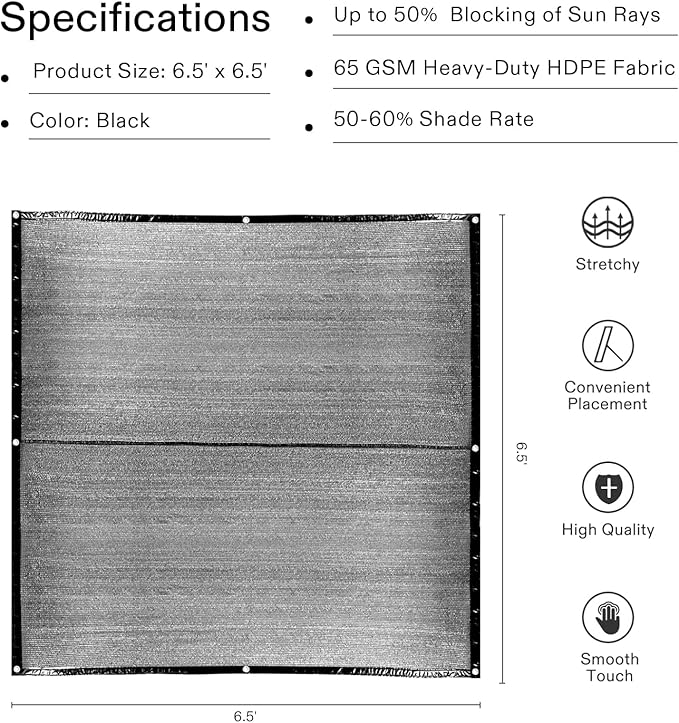 - Several Applications: This 6.5 x 6.5 ft. shade net can protect your family, animals, and plants from the sun; Create a shade in your yard, patio, open garage, garden, or pool; You can also combine multiple shades of different sizes to cover larger areas