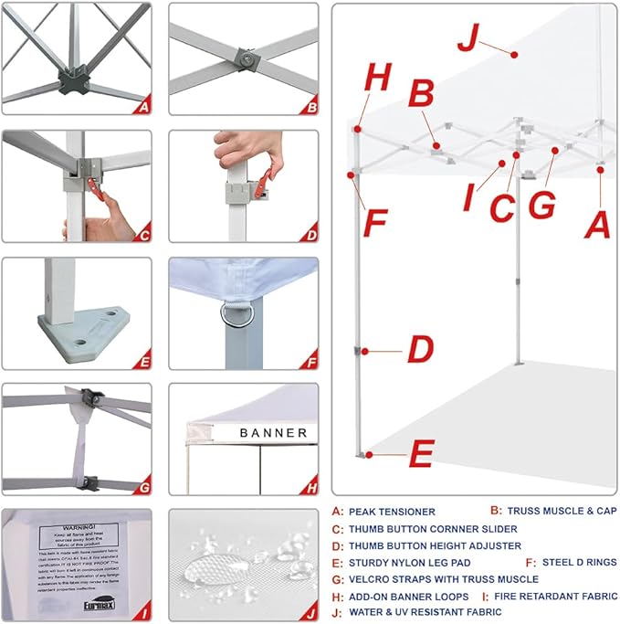 - Easy Setup:With the latest thumb lock system and three height positions, assembling and taking down the canopy is a breeze, and you can adjust the clearance height from 10.5ft to 11.1ft. Enjoy quick setup, so you can focus on enjoying your event without the stress of complicated assembly.