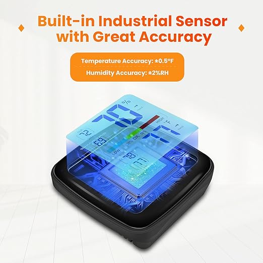 - The Best Industrial Grade Accuracy: Humidity gauge with built-in Swiss sensors, it detects subtle humidity and temperature changes and updates readings in each 10 seconds. Temperature tolerance is within 0.5℉(-4 to 158℉) and humidity is 2%RH (1 to 99% RH). The digital hygrometer is pre-calibrated for accurate temperature and humidity measurement.