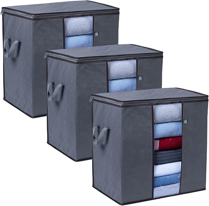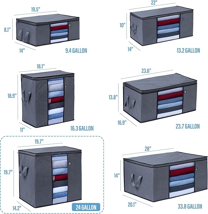 - EXTRA-LARGE SIZE: 19.7” W x 19.7” H x 14.2” D. 24 Gallons or 90 Liters of storage capacity. Large capacity to fit various items such as clothes, towels, linens, sheets, blankets, throws, quilts, comforters, bedding, pillows, curtains, shoes, plushies, etc. Multifunctional and ideal for storing seasonal clothing, transporting your bedding or towels during moves, organizing all your belongings, and freeing up extra closet and drawer space. Conveniently store under or on top of your closet rack.