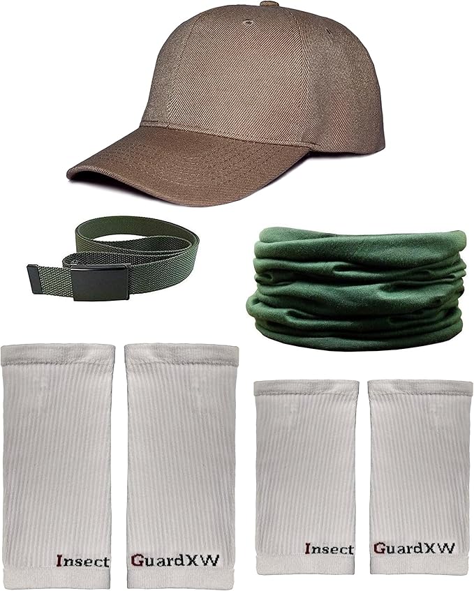 - This package includes 1 Khaki Size Adjustable Hat, 1 Green Length Adjustable 54 Inch Fabric Belt, 1 Pair of White 12 Inch Long EXTRA WIDE Tick Gaiters / Sleeve Cuffs, 1 Pair of White 7 Inch Long EXTRA WIDE Tick Gaiters / Sleeve Cuffs and 1 Green Tube Bandana. Registered to Repel MOSQUITOES, TICKS, FLIES & Other Insects that may Carry and Transmit Viruses and Diseases like the ZIKA VIRUS, WEST NILE VIRUS and LYME DISEASE. Great as - gifts for women, gifts for men and gifts for mom