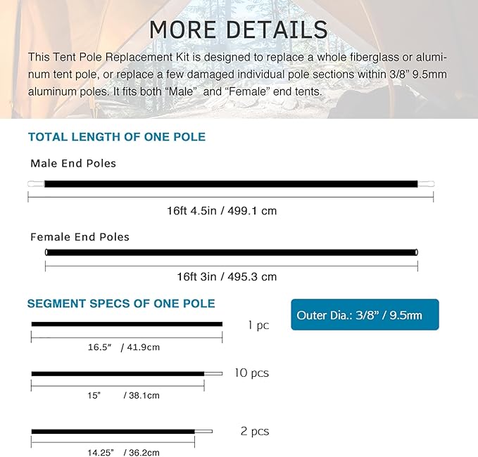 - FIT MALE & FEMALE ENDS - Not all poles are MALE ends. You could assemble our tent pole repair kit to make it either MALE or FEMALE.