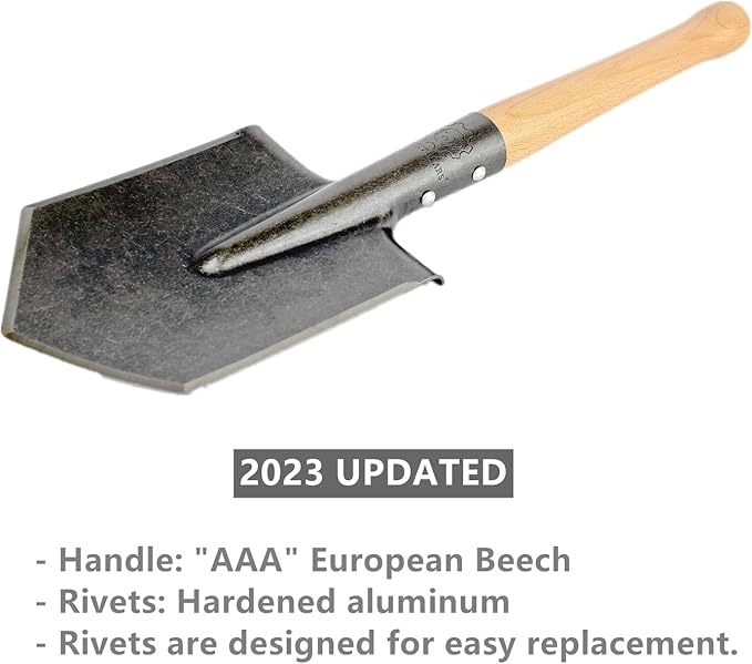 - 🐶 2023 Updated Handle; The overall length is 53 cm. Handle Material: "AAA" European Beech, it is known for its durability, strength, and resistance to wear and tear. It has excellent shock-absorbing properties, which make it suitable for absorbing the impact and vibrations that occur during shovel usage. The rivets used are updated to hardened aluminum, specifically designed to allow for easy replacement when needed.