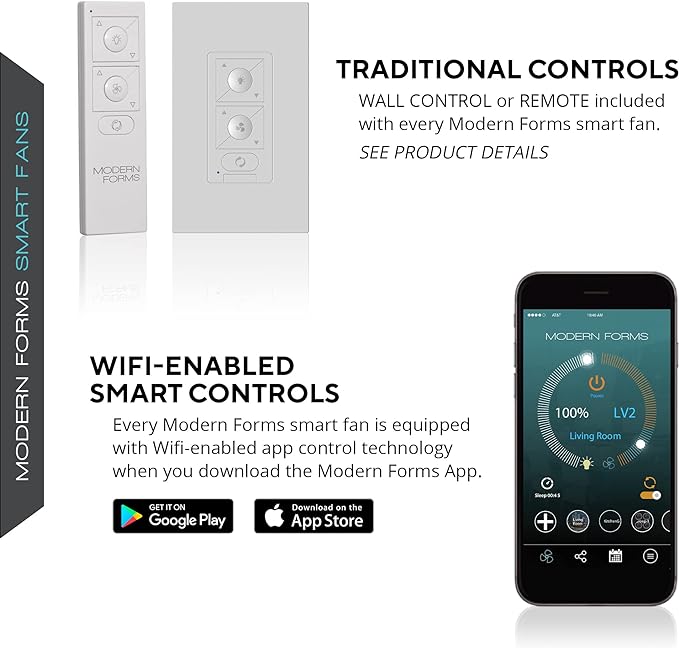 - APP CONTROLLED: Sync with our exclusive Modern Forms app to control fan speed, use smart features like breeze mode, adaptive learning, create groups, and reduce energy costs. New: Bluetooth compatible for improved range and an unlimited amount of fans can be controlled with remote or wall control within range.