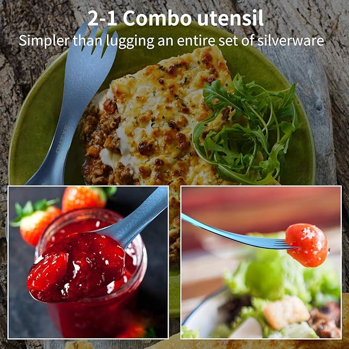 - Ultra-lightweight: A fork and spoon combo all-in-one piece, no need to worry about being weighed down by lugging an entire set of silverware on the go, only 20g/0.7oz each
