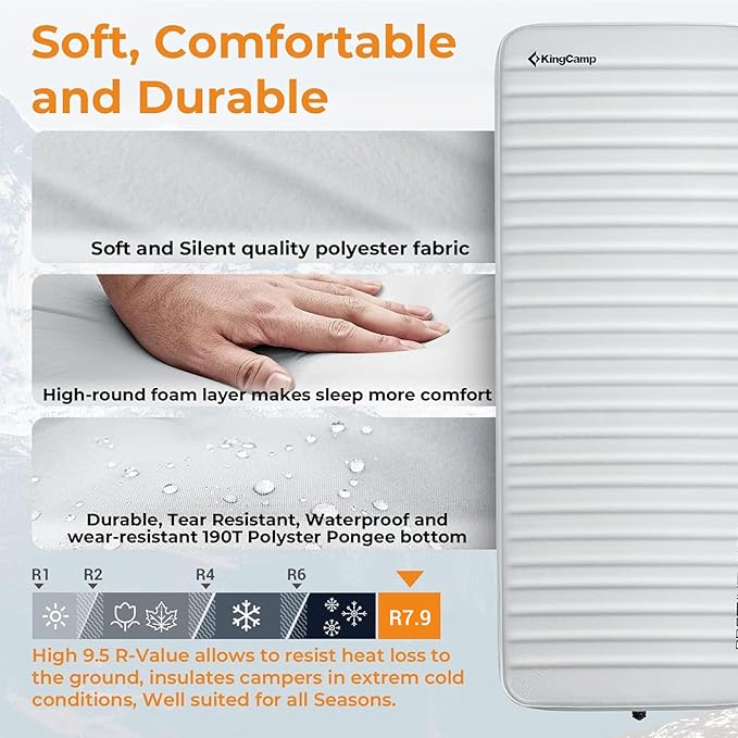 - HIGH R-VALUE 7.9 FOR SUPERIOR INSULATION: The KingCamp foam sleeping pad boasts an impressive R-value of 7.9, offering excellent insulation to keep you warm by effectively blocking the cold ground. Whether you're camping in chilly spring, fall, or winter conditions, this pad ensures you stay cozy and comfortable all night long.