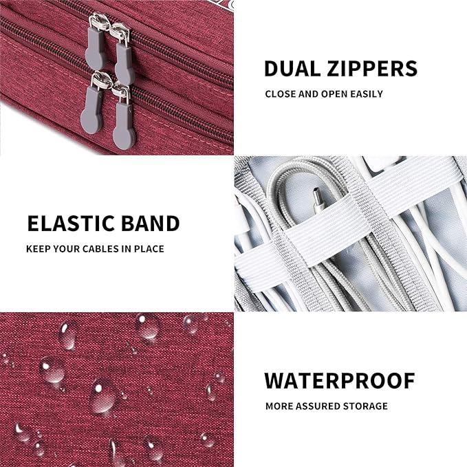 - WATERPROOF & PROTECTED - This cable case is made of water resistant polyester material. With the padded foam around to protect all the things inside the bag, the fabric is easy to clean, 2 way zippers make it easier to open and close the bag to take your charger cable or any other electronic accessories in a short time