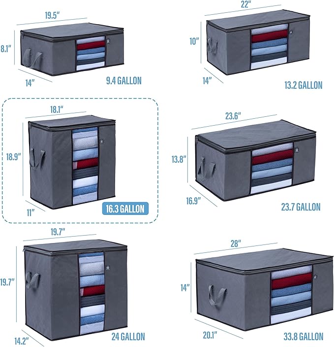 - LARGE SIZE: 18.1” W x 18.9” H x 11” D. 16.3 Gallons or 61.7 Liters of storage capacity. Large capacity to fit various items such as clothes, towels, linens, sheets, blankets, throws, quilts, bedding, pillows, curtains, shoes, etc. Multifunctional and ideal for storing seasonal clothing, transporting your bedding during moves, organizing your belongings, and freeing up closet and drawer space. Conveniently stack under your closet rack or store on top of your closet rack.