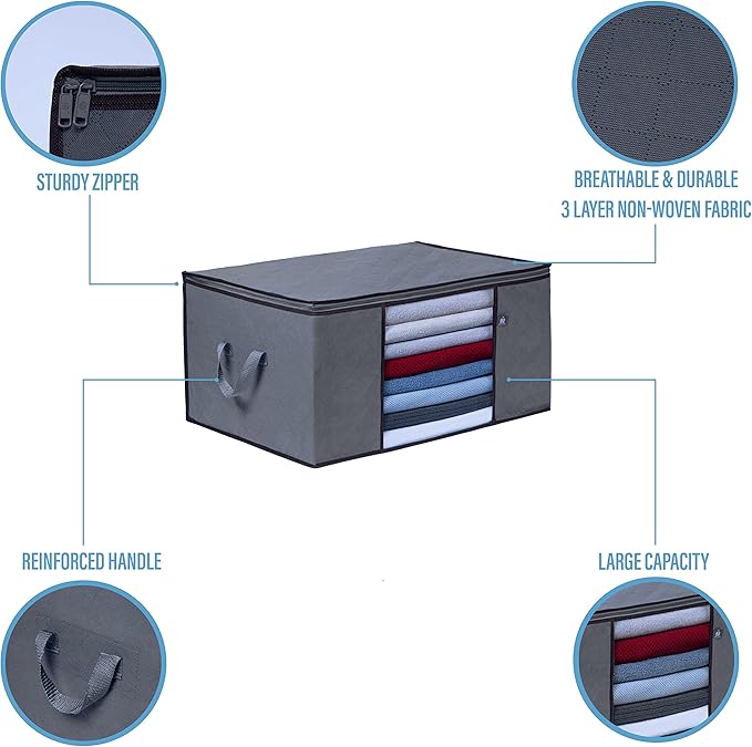 - OVERSIZE: 28” W x 14” H x 20” D. 34 Gallons or 129 Liters of storage capacity. Large capacity and spacious enough to fit various items such as clothes, towels, linens, sheets, blankets, throws, quilts, comforters, bedding, pillows, curtains, shoes, etc. Multifunctional and ideal for storing seasonal clothing, transporting your bedding or towels during moves, organizing your belongings, and freeing up extra closet and drawer space. Conveniently stack and store under your closet rack.