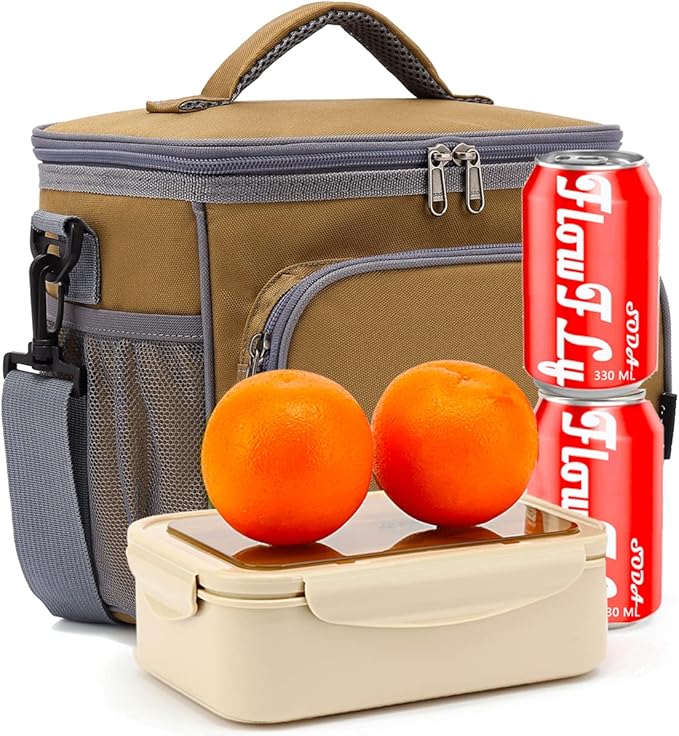 FlowFly Insulated Reusable Lunch Bag Adult Large Lunch Box for Women and Men with Adjustable Shoulder Strap,Front Zipper Pocket and Dual Large Mesh Side Pockets,Brown
