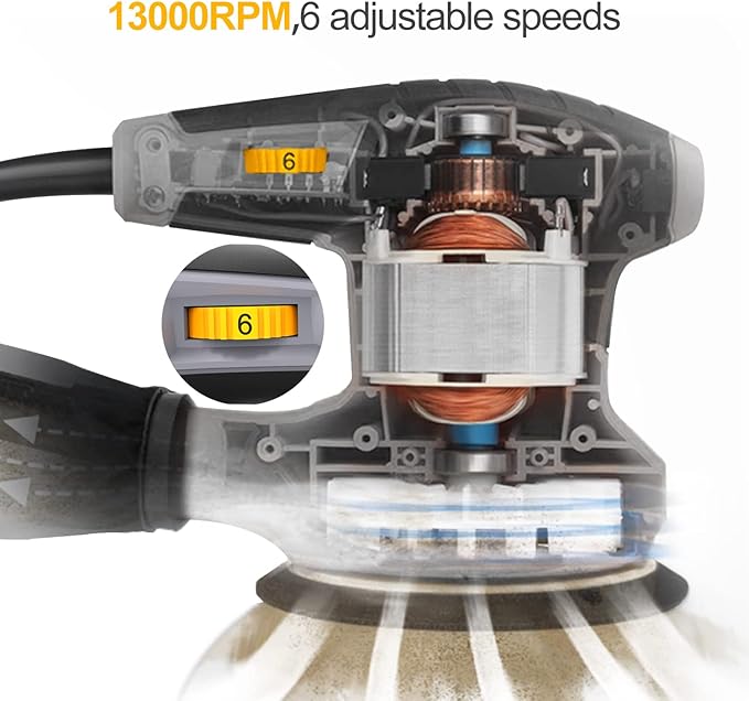 - ▶【360° Rotating Base Plate & 6 Adjustable Speeds 】Dual-Action Random 360° Rotating Sanding Base Plate, it can rotate and vibrate. Ensures that the sanding surface is natural without traces and increase the grinding efficiency by 30%. 6 Adjustable speed dial supports you to monitor the exactly right speed according to different work. You can choose the most fitting speed from sanding to polishing.