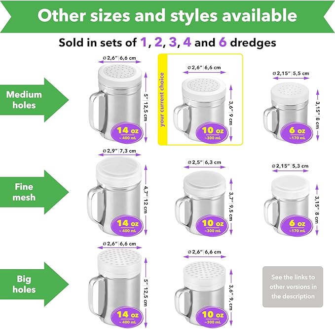 - You will receive two stainless steel cooking dredges (10 oz) with handles, twist-off lids, and plastic caps; style: medium