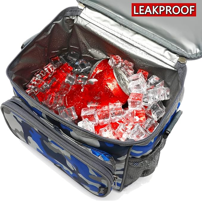 FlowFly Insulated Reusable Lunch Bag Adult Large Lunch Box for Women and Men with Adjustable Shoulder Strap,Front Zipper Pocket and Dual Large Mesh Side Pockets,BlueCamo