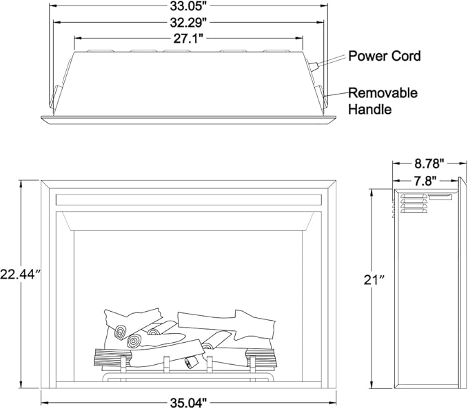 - Overall dimensions: 35 " W x 22.4 " H x 8.8 " D. Old brick interior has a fade effect at the flame area to make it looks more realistic when the flame is on, please noted before ordering.