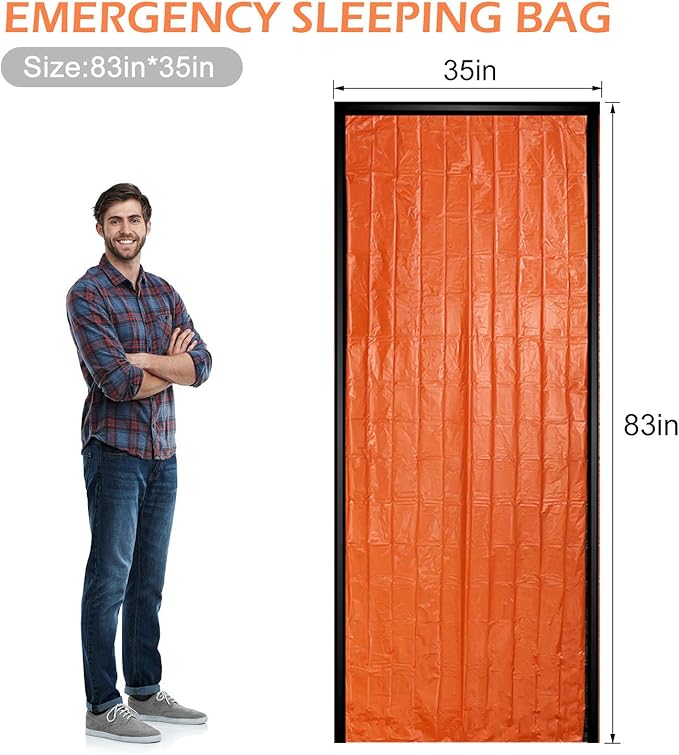 - 【Easy to Use】Just pull out the bivy sack, unroll and climb inside.Emergency sleeping bag can be used as a sleeping bag liner to keep your body temperature by reflecting back and retaining 90% of heat. Orange is a great color for signaling, so it is a great camping survival gear in your bug out bag.