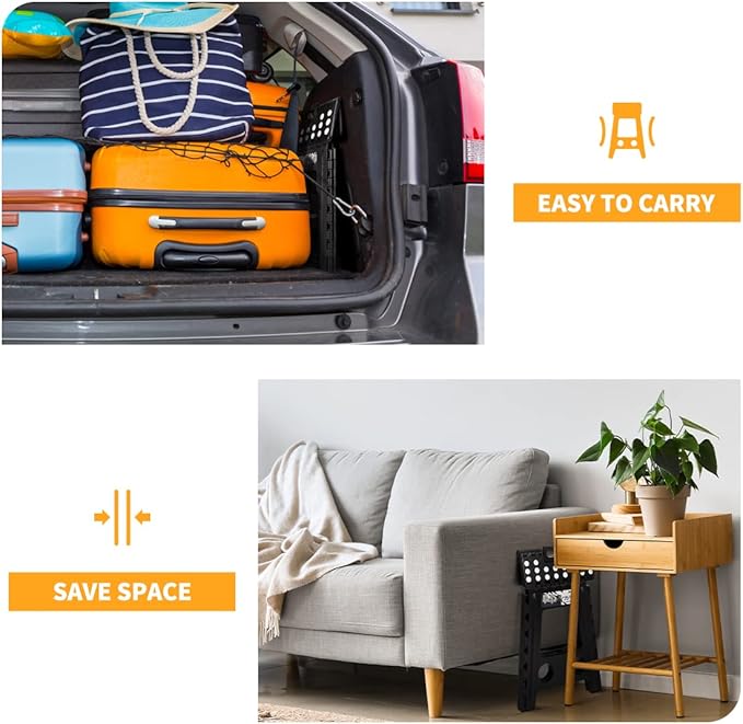 - Space-Saving Folding Stool : Our foldable plastic stool is designed to save up to 90% of space when folded. It's easy to store under the bed, in a closet, or in tight spaces between furniture. Plus, it fits perfectly in your car trunk—ideal for small apartments and road trips