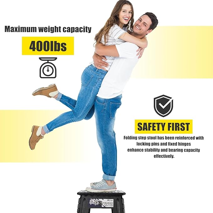 - Strong & Sturdy Step Stool: The portable folding stool supports up to 400 lbs, making it sturdy enough for adults. To ensure even weight distribution and avoid damage, stand with both feet firmly on the one-step stool