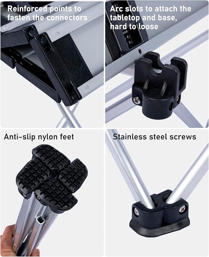 - Ultralight, made of aerospace-grade aluminum alloy, only 3 lbs; Max Load 66 lbs; Unlike wooden or nylon-top tables, this table is durable, waterproof, corrosion-resistant, easy to clean; Sturdy joints and connectors, plus anti-slip rubber feet make this table more stable, and the legs won't fold, bend, or disengage on different terrain; Very easy to set up, just open the base frame and attach the table top, enjoy your leisure time in seconds, you can also check the video in this page to see more details