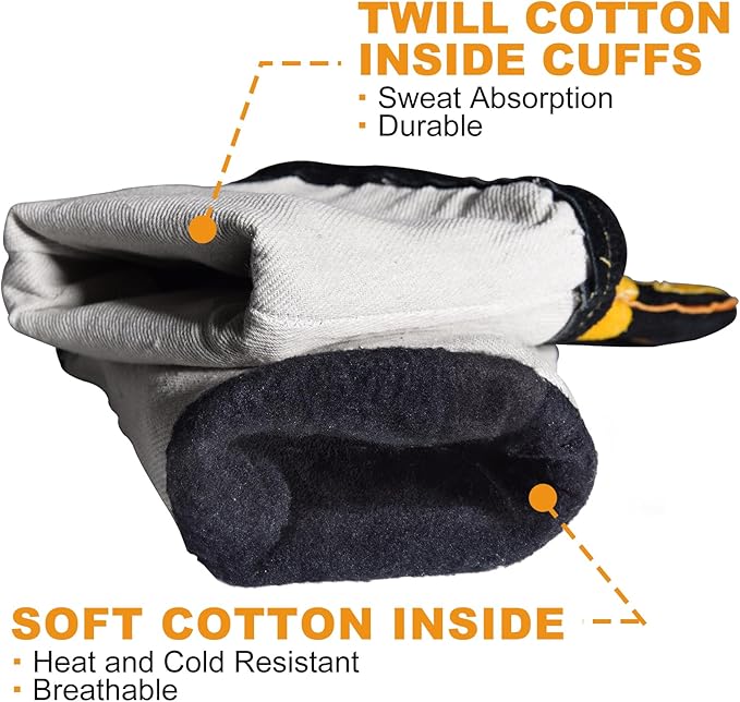 - Superior Comfort: 100% soft insulated cotton lined interior makes gloves have better heat resistance, cold resistance, sweat absorption and breathable during use. these welding gloves are quite comfortable even when worn for a long time