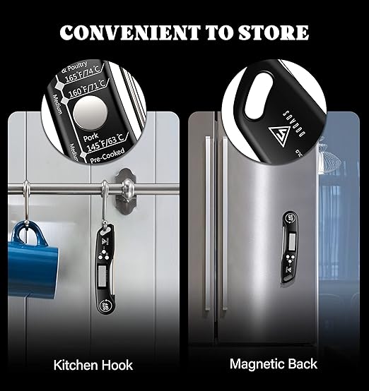 - MORE FUNCTIONS: ①You can read the Internal temperature after removing the kitchen temperature probe from the food by the Hold button! ②MAX/MIN: Short press to show the MAX/MIN temperature value for the tested food. ③Turkey Thermometer will Auto-shutoff if readout stays on for 10min! The cooking thermometer probe turns on/off when you unfold/fold the probe. ④Magnetic back and hook allow for convenient storage. It is perfect for Baking, Sourdough, Dough Bread.